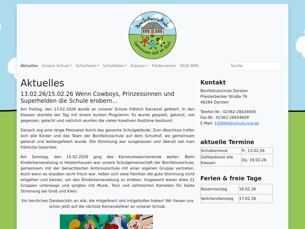 Das Schulleben an der Bonifatiusschule wird von vielfältigen Aktivitäten geprägt, die über den regulären Unterricht hinausgehen. So sind beispielsweise Schülerinnen und Schüler regelmäßig an Sportprojekten beteiligt, wie der kürzlich gewonnene Dorstener Tischtennis Grundschul-Cup zeigt, bei dem Kinder beider Jahrgänge ihre Fähigkeiten trainieren konnten. Auch traditionelle Schulevents wie Karnevalsfeiern werden von der gesamten Schulgemeinschaft mitgestaltet, sowohl innerhalb des Schulgebäudes als auch durch die Teilnahme an städtischen Veranstaltungen wie dem Kinderkarnevalszug in Holsterhausen. Diese Angebote unterstreichen das Schulverständnis, dass gemeinsames Handeln und gegenseitige Unterstützung zentral sind. Das Schulmotto "Gemeinsam sind wir stark" wird dabei nicht nur als Leitsatz proklamiert, sondern durch konkrete Projekte gelebt.