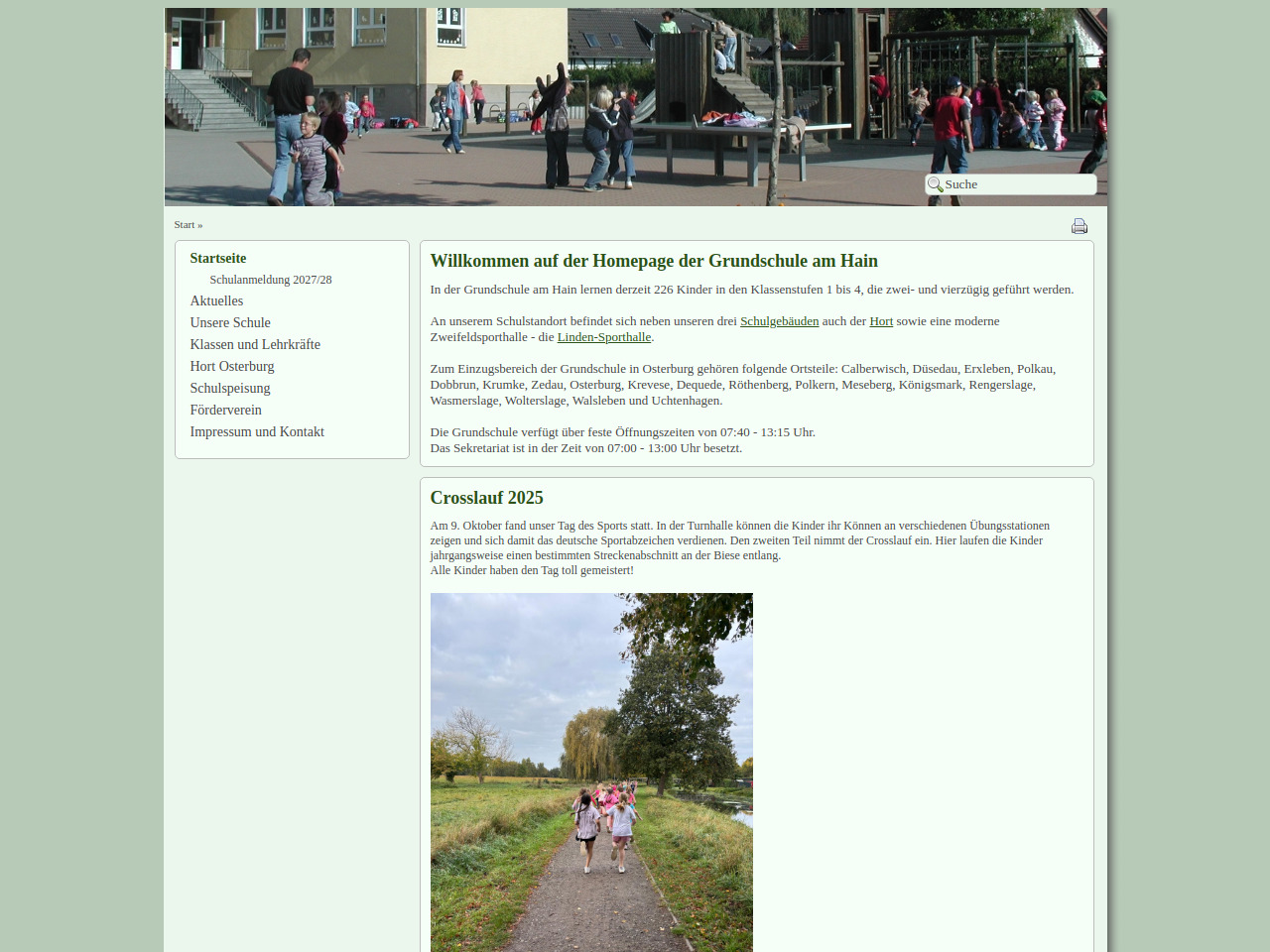 Die Grundschule am Hain in der Hansestadt Osterburg (Altmark) ist eine Grundschule für die Klassenstufen 1 bis 4. An dem Schulstandort lernen derzeit 226 Kinder in zwei- und vierzügig geführten Klassen. Die Schule verfügt über insgesamt drei Schulgebäude und ist damit eine größere Grundschule in der Region. Der Schulstandort bietet neben den Unterrichtsgebäuden auch weitere Einrichtungen wie einen angegliederten Hort und eine moderne Zweifeldsporthalle, die Linden-Sporthalle genannt wird. Diese räumliche Ausstattung ermöglicht es, Sport und Bewegung als wichtige Bestandteile des Schulalltags umzusetzen. Die Schule ist täglich von 07:40 bis 13:15 Uhr geöffnet, wobei das Sekretariat von 07:00 bis 13:00 Uhr erreichbar ist. Zum Einzugsbereich der Grundschule gehören neben Osterburg selbst auch zahlreiche umliegende Ortsteile wie Calberwisch, Düsedau, Erxleben, Polkau, Dobbrun, Krumke und weitere.