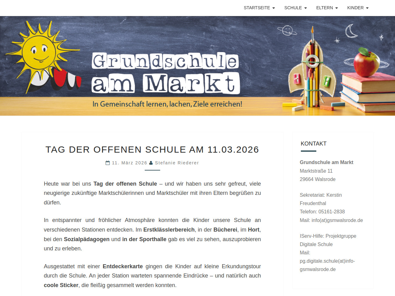 Eltern, deren Kinder die Grundschule am Markt besuchen oder besuchen möchten, können sich jederzeit an das Schulsekretariat wenden. Ansprechpartnerin ist Schulsekretärin Kerstin Freudenthal. Die Schule ist telefonisch unter 05161-2838 erreichbar oder per E-Mail unter info(at)gsmwalsrode.de. Für Fragen zur digitalen Infrastruktur und zum Schulnetzwerk steht die Projektgruppe Digitale Schule zur Verfügung. Die Grundschule am Markt lädt Interessierte herzlich