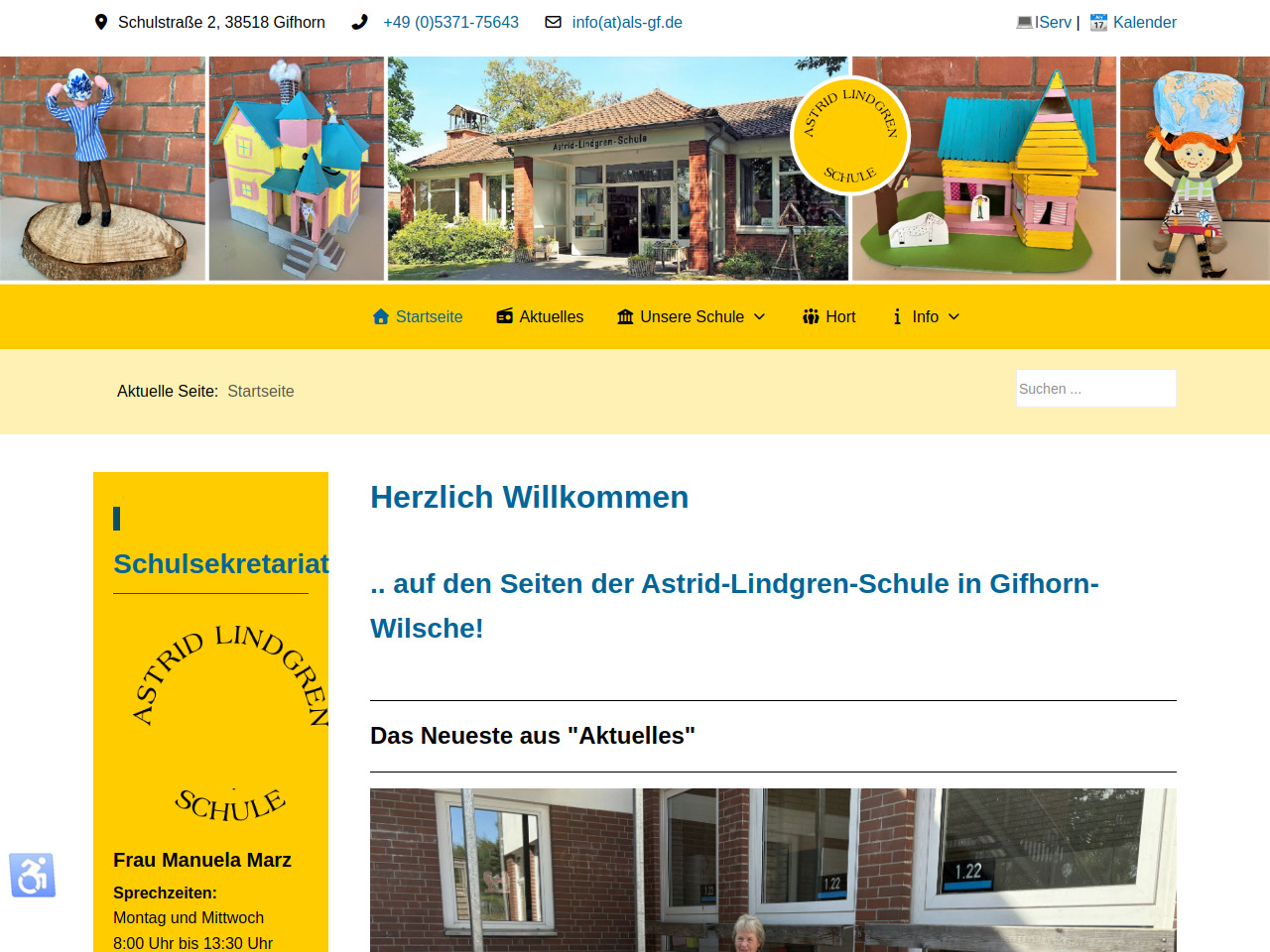 Die Astrid-Lindgren-Schule ist unter der Telefonnummer 05371/75643 und per E-Mail unter info@als-gf.de erreichbar. Das Schulsekretariat mit Frau Manuela Marz ist montags und mittwochs von 8:00 bis 13:30 Uhr persönlich für Fragen und Anliegen verfügbar.