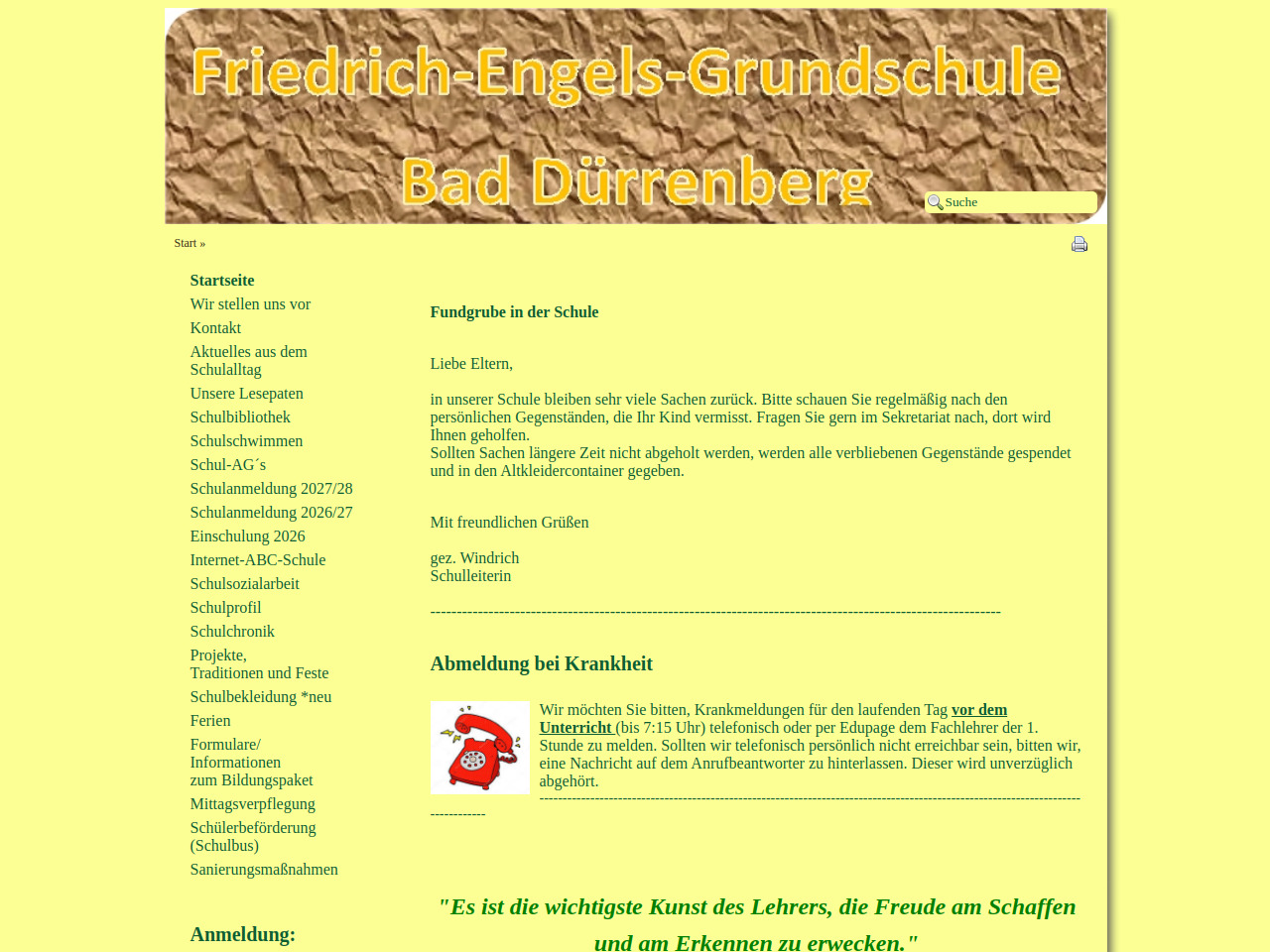 Die Grundschule "Friedrich Engels" bietet regelmäßige Anmeldezeiträume für zukünftige Schüler an, wie zum Beispiel die Schulanmeldung für 2027/28 und 2026/27. Interessierte Eltern können sich auf der Schulwebseite über die genauen Anmeldetermine und erforderlichen Unterlagen informieren.