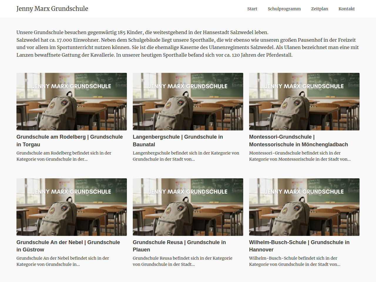 Um die Jenny Marx Grundschule mit anderen Grundschulen in Salzwedel zu vergleichen, sind Informationen zu Leistungsergebnissen, Schulausstattungen und pädagogischen Konzepten notwendig. Die Jenny Marx Grundschule zeichnet sich durch ihre überschaubare Größe mit 185 Schülern und gute Sporteinrichtungen aus.