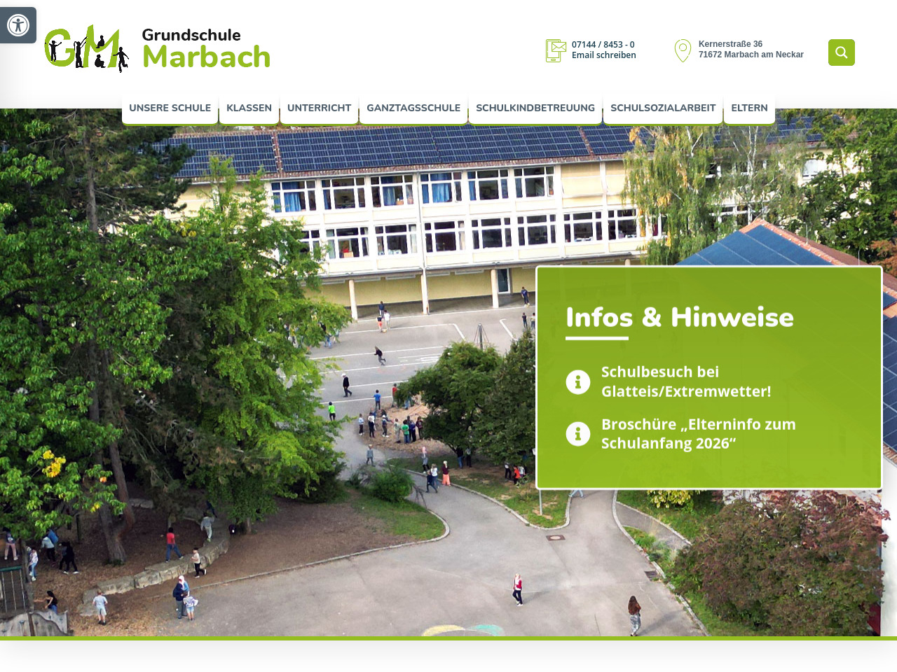 Die Grundschule Marbach befindet sich in der Kernerstraße 3 in 71672 Marbach am Neckar und ist über die Telefonnummer 07144/8453-0 erreichbar. Die Schule liegt zusammen mit den weiterführenden Schulen auf dem Schulcampus im Süden der Stadt, was eine gute Infrastruktur für Schüler aller Schularten bietet.