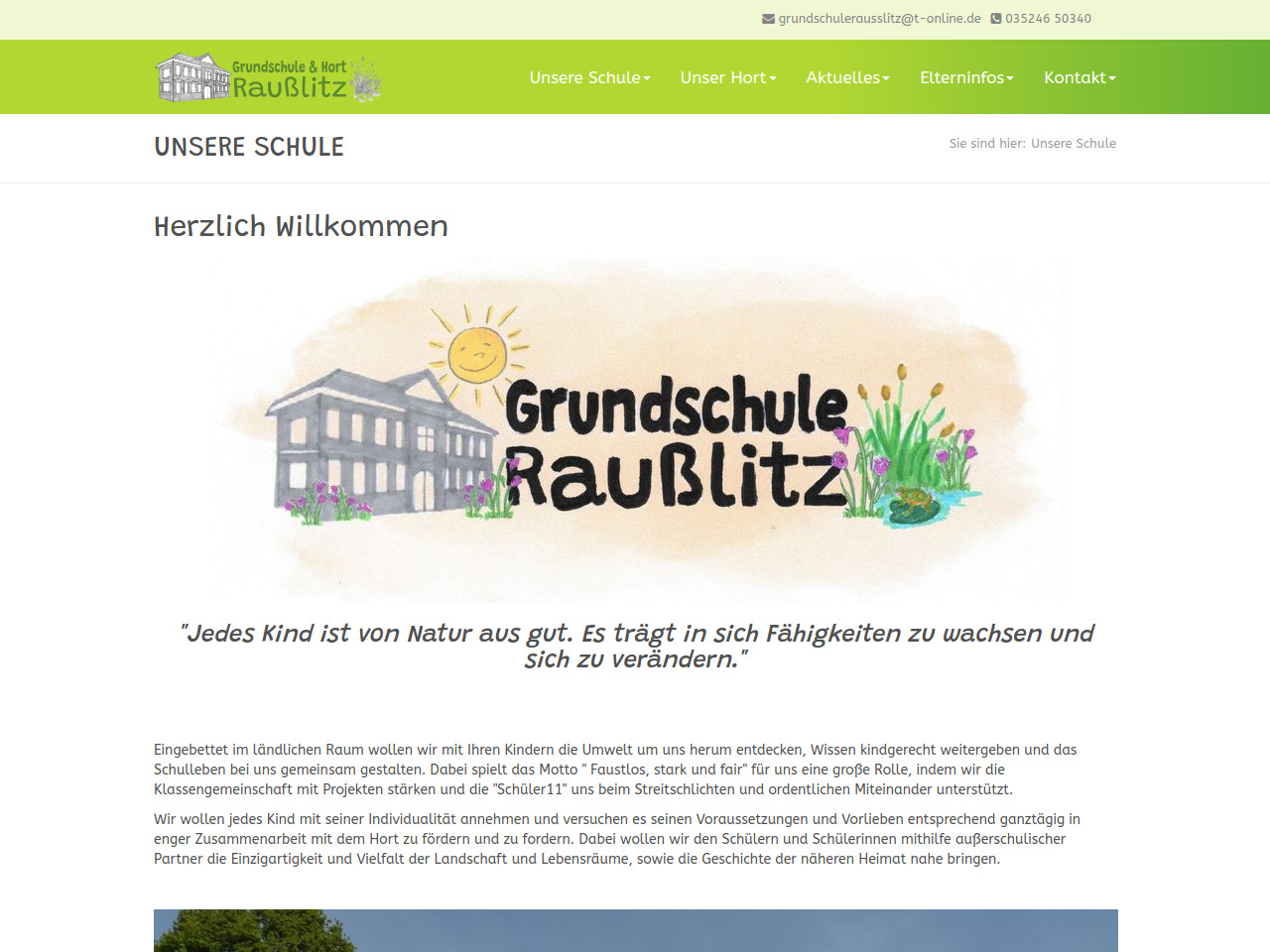 Eingebettet in den ländlichen Raum der Region möchte die Grundschule Raußlitz mit ihren Schülern und Schülerinnen die Umwelt entdecken und Wissen kindgerecht vermitteln. Durch die Zusammenarbeit mit außerschulischen Partnern wird versucht, den Kindern die Einzigartigkeit und Vielfalt der Landschaften und Lebensräume sowie die Geschichte der näheren Heimat näherzubringen. Zusätzlich nimmt die Schule am EU-Schulprogramm teil und stellt ihren Schülern ab der zweiten Schulwoche frisches Obst und Gemüse zur Verfügung. Für Fragen und Anmeldungen können Eltern die Schule unter der Telefonnummer 035246 50340 oder per E-Mail unter grundschulerausslitz@t-online.de erreichen.