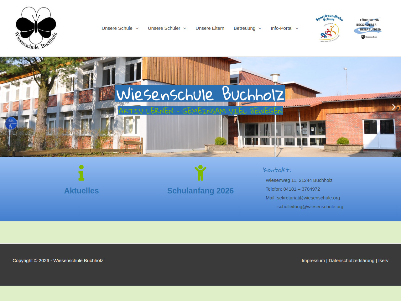 Die Wiesenschule Buchholz ist in Niedersachsen gelegen und hat ihre Adresse am Wiesenweg 11 in 21244 Buchholz. Das Sekretariat ist unter der Telefonnummer 04181 – 3704972 erreichbar und beantwortet gerne Ihre Fragen zu Lage, Erreichbarkeit und schulischen Angelegenheiten.