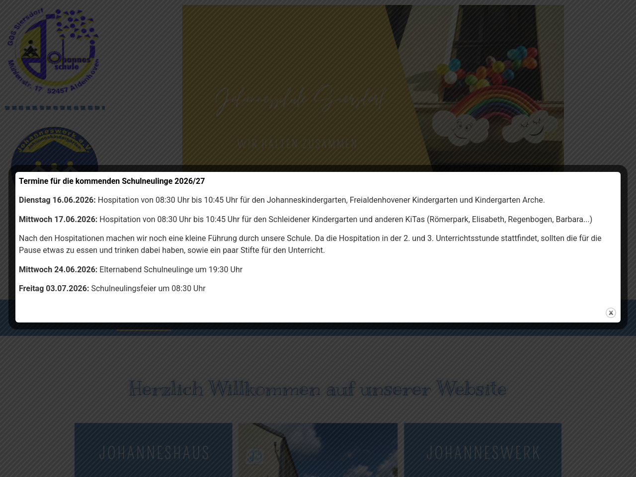 Die Johannesschule in Siersdorf ist eine Grundschule der Gemeinde Aldenhoven und richtet sich an Kinder der Klassenstufen 1 bis 4. Sie befindet sich in Nordrhein-Westfalen und wird von der Gemeinde Aldenhoven getragen. Die Schule versteht sich als Ort des Lernens und der Persönlichkeitsentwicklung, an dem Kinder nicht nur Wissen vermittelt bekommen, sondern auch soziale und emotionale Kompetenzen entwickeln sollen. Mit verschiedenen Projekten und regelmäßigen schulischen Aktivitäten schafft die Johannesschule ein vielfältiges Lernumfeld, das über den reinen Unterricht hinausgeht.