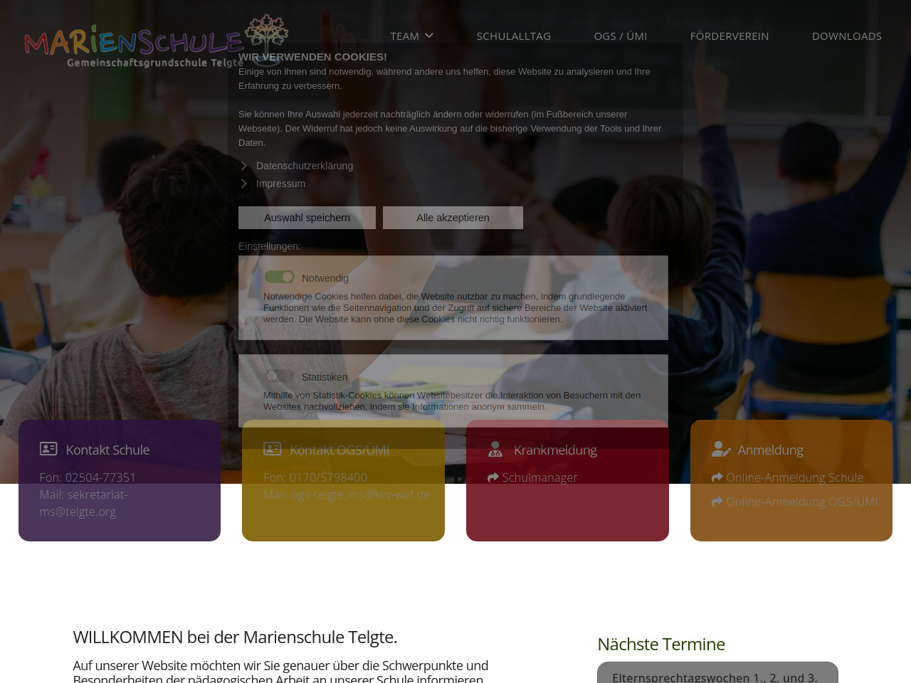 Die Marienschule Telgte bietet eine Online-Anmeldung für Schülerinnen und Schüler an, die auf der Website der Schule durchgeführt werden kann. Zusätzlich zur Schulanmeldung können Eltern auch eine separate Online-Anmeldung für die OGS oder Übermittagsbetreuung vornehmen.