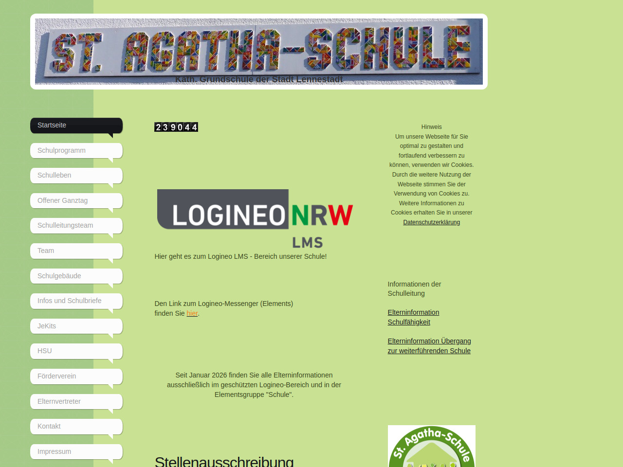 Die St.-Agatha-Schule nutzt Logineo LMS als digitale Plattform für die Kommunikation mit Eltern. Seit Januar 2026 werden alle Elterninformationen ausschließlich im geschützten Logineo-Bereich und über die Elementsgruppe "Schule" bereitgestellt.